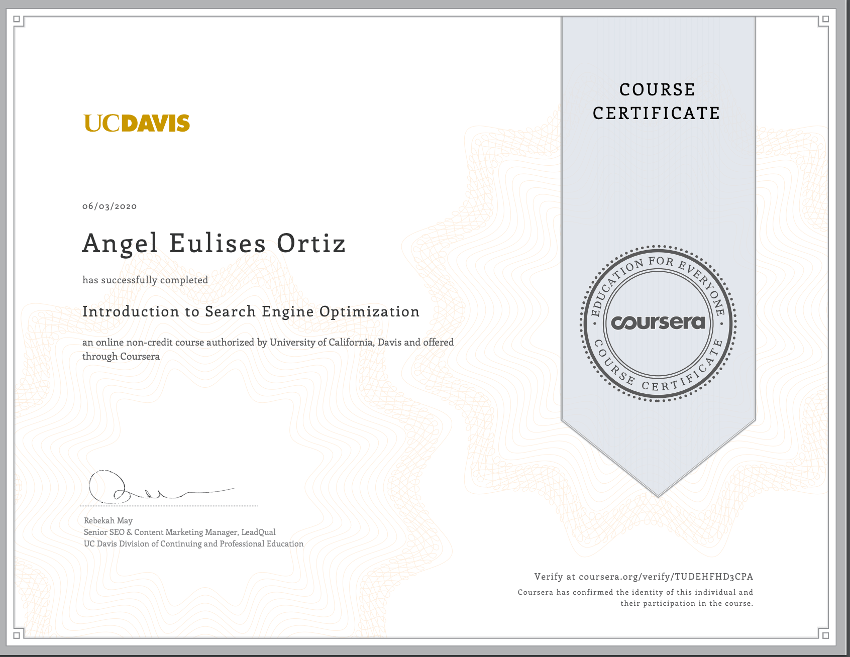 Certificado Introducción a la optimización en Motores de Búsqueda (SEO).Se trata de un curso de la UcDavis, por medio de Coursera, que terminé ya hace algunas semanas, en inglés pero que disfruté montones y ya les cuento porqué.